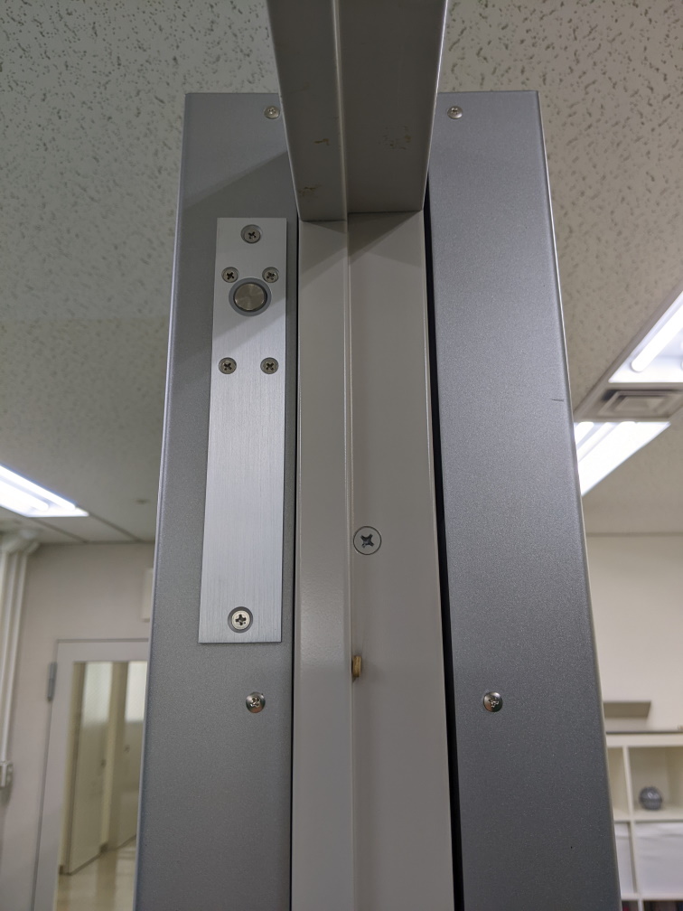 退室側はRFIDカードリーダーと非常用解錠ボタンがあり、退室時に入室の記録はタブレットから削除されます。電磁錠は閂タイプと電磁石タイプとありますので、必要な強度に応じてお選びいただけます。入室側と退室側のリーダーはパーティション上部で金具による接続となります。