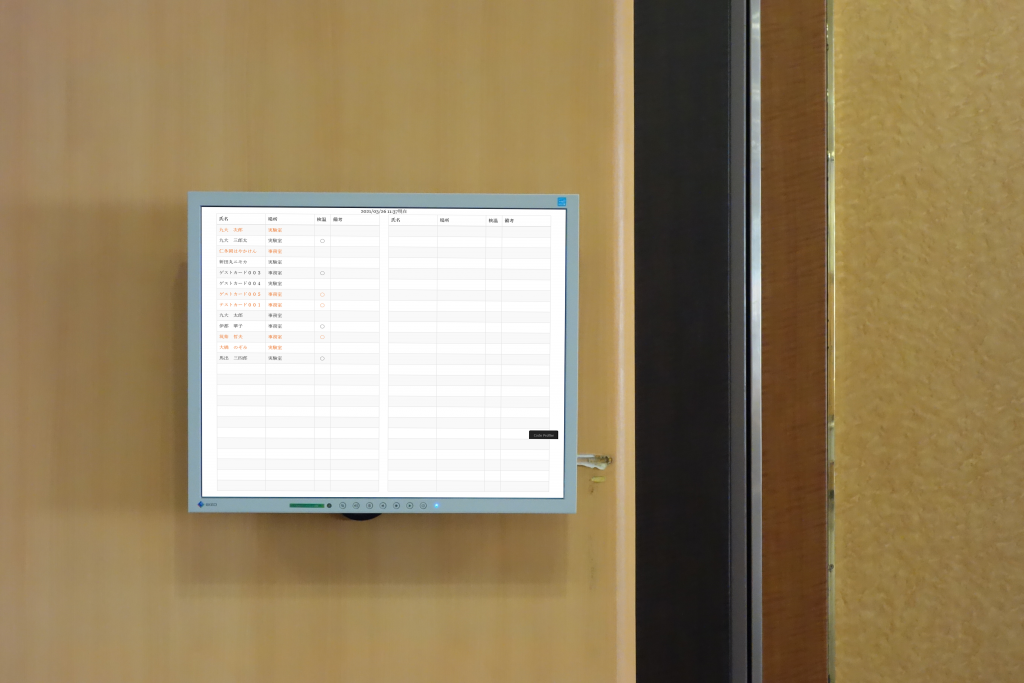 事務室等の部屋の壁に大型ディスプレイ等を設置し、誰がどこに居るのかを表示します。複数台設置する事で大人数でも対応可能です。